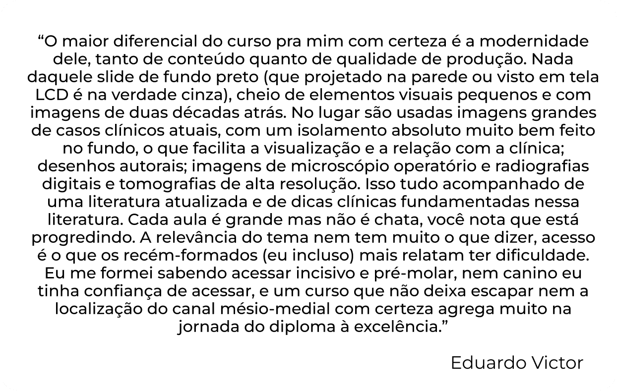 “O maior diferencial do curso pra mim com certeza é a modernidade dele, tanto de conteúdo quanto de qualidade de produção. Nada daquele slide de fundo preto (que projetado na parede ou visto em tela LCD é na verdade cinza), cheio de elementos visuais pequenos e com imagens de duas décadas atrás. No lugar são usadas imagens grandes de casos clínicos atuais, com um isolamento absoluto muito bem feito no fundo, o que facilita a visualização e a relação com a clínica; desenhos autorais; imagens de microscópio operatório e radiografias digitais e tomografias de alta resolução. Isso tudo acompanhado de uma literatura atualizada e de dicas clínicas fundamentadas nessa literatura. Cada aula é grande mas não é chata, você nota que está progredindo. A relevância do tema nem tem muito o que dizer, acesso é o que os recém-formados (eu incluso) mais relatam ter dificuldade. Eu me formei sabendo acessar incisivo e pré-molar, nem canino eu tinha confiança de acessar, e um curso que não deixa escapar nem a localização do canal mésio-medial com certeza agrega muito na jornada do diploma à excelência.”