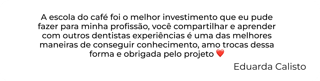 A escola do café foi o melhor investimento que eu pude fazer para minha profissão, você compartilhar e aprender com outros dentistas experiências é uma das melhores maneiras de conseguir conhecimento, amo trocas dessa forma e obrigada pelo projeto ❤️