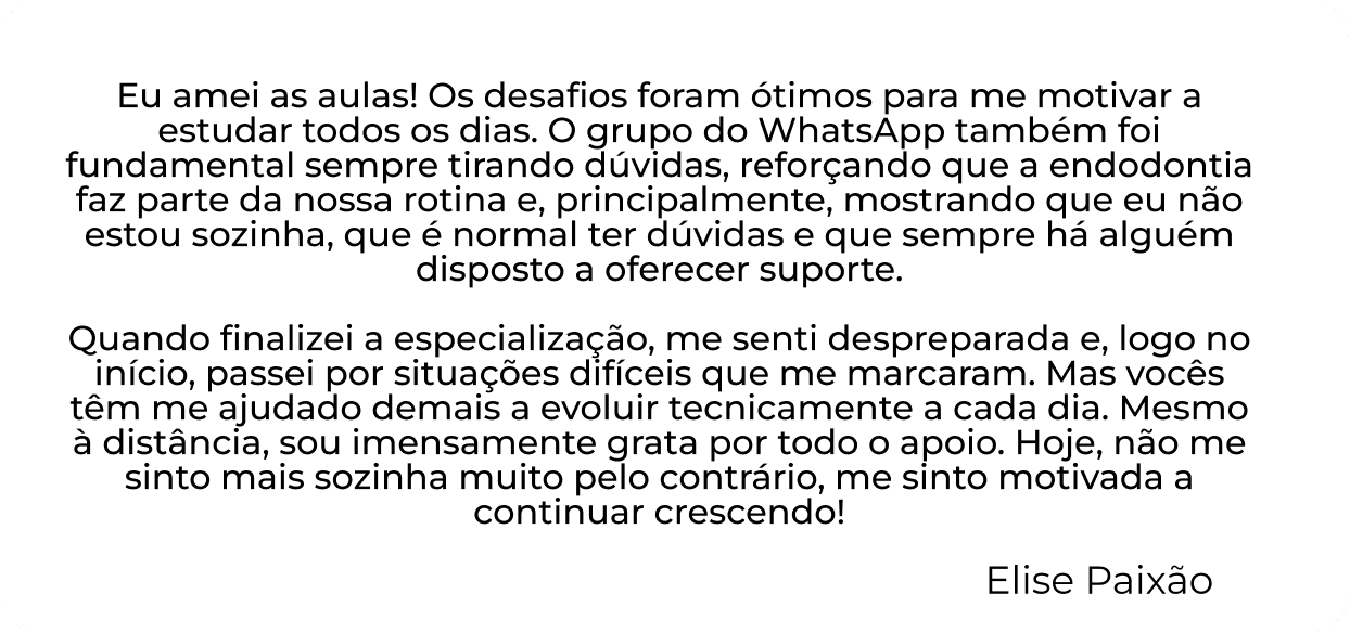 Eu amei as aulas! Os desafios foram ótimos para me motivar a estudar todos os dias. O grupo do WhatsApp também foi fundamental sempre tirando dúvidas, reforçando que a endodontia faz parte da nossa rotina e, principalmente, mostrando que eu não estou sozinha, que é normal ter dúvidas e que sempre há alguém disposto a oferecer suporte.