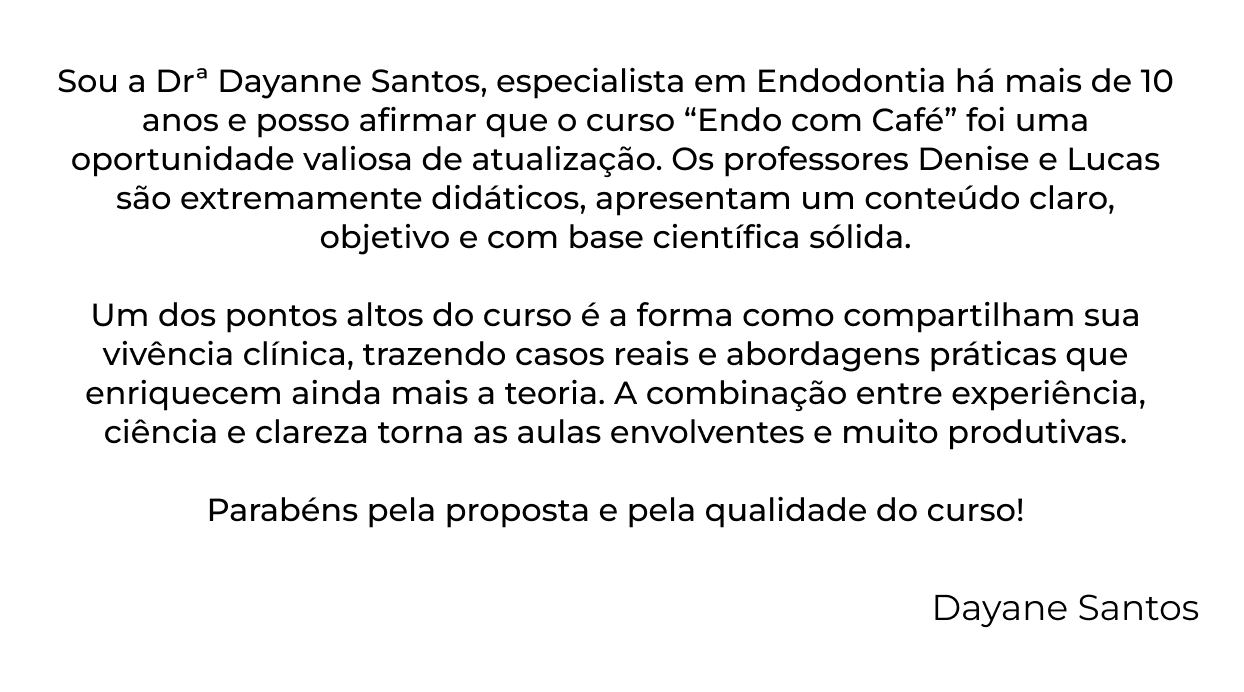 Sou a Drª Dayanne Santos, especialista em Endodontia há mais de 10 anos e posso afirmar que o curso “Endo com Café” foi uma oportunidade valiosa de atualização. Os professores Denise e Lucas são extremamente didáticos, apresentam um conteúdo claro, objetivo e com base científica sólida.