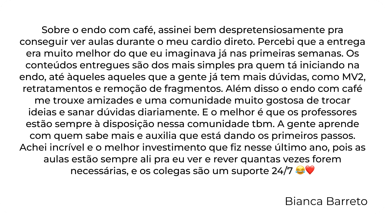 Sobre o endo com café, assinei bem despretensiosamente pra conseguir ver aulas durante o meu cardio direto. Percebi que a entrega era muito melhor do que eu imaginava já nas primeiras semanas. Os conteúdos entregues são dos mais simples pra quem tá iniciando na endo, até àqueles aqueles que a gente já tem mais dúvidas, como MV2, retratamentos e remoção de fragmentos. Além disso o endo com café me trouxe amizades e uma comunidade muito gostosa de trocar ideias e sanar dúvidas diariamente. E o melhor é que os professores estão sempre à disposição nessa comunidade tbm. A gente aprende com quem sabe mais e auxilia que está dando os primeiros passos. Achei incrível e o melhor investimento que fiz nesse último ano, pois as aulas estão sempre ali pra eu ver e rever quantas vezes forem necessárias, e os colegas são um suporte 24/7 😂❤️